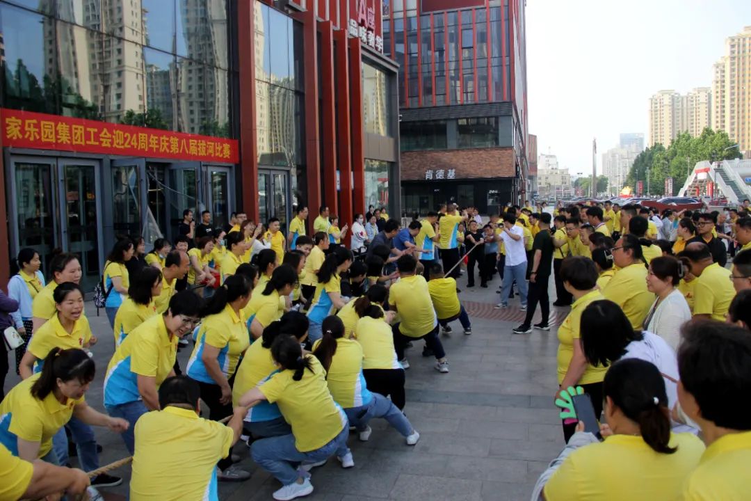 值此家樂(lè)園集團(tuán)24周年慶來(lái)臨之際,為進(jìn)一步提高團(tuán)隊(duì)士氣,增強(qiáng)企業(yè)凝聚力,豐富員工業(yè)余文化生活,6月20日上午,家樂(lè)園集團(tuán)工會(huì)在天一廣場(chǎng)舉辦第八屆員工拔河比賽,商業(yè)總公司、地產(chǎn)總公司、物業(yè)總公司、電梯公司等專業(yè)公司派出“精兵強(qiáng)將”及“啦啦隊(duì)”,組成十八支代表隊(duì),共近300人參加了本次活動(dòng)。