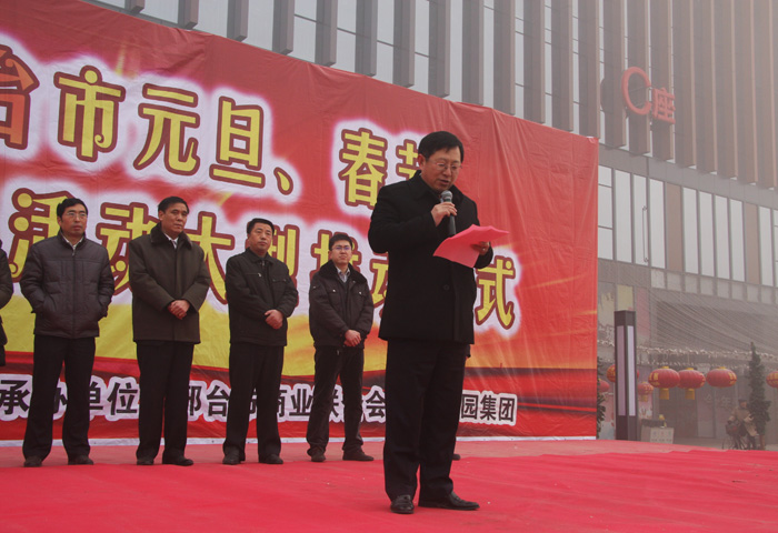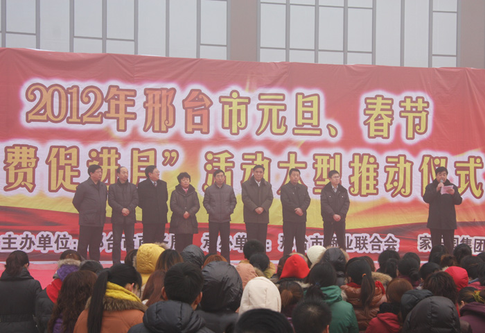 為了響應省政府號召,邢臺市商務局于2012年1月10日上午,在邢臺天一廣場隆重舉行“2012邢臺市年元旦、春節消費促進月”活動大型推進儀式。作為該儀式的協辦單位,家樂園集團總裁陳云峰代表全市20多家骨干企業發表倡議書。